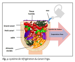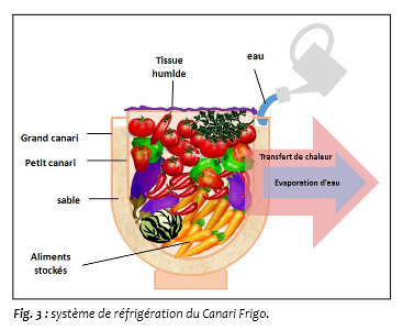 Le canari-frigo permet de conserver des fruits ou légumes à 20° (quand il fait 40° dehors et que le climat est sec), en utilisant 2 jarres en terre cuite emboitées l’une dans l’autre, et séparées par une couche de sable de 5cm humidifiée… Il devrait pouvoir s’obtenir (de la fabrication à la vente) à moins de 15€.